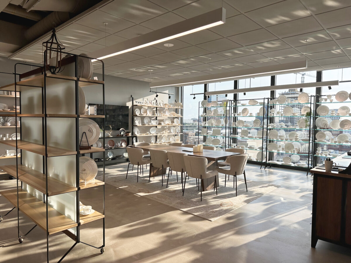 In Chicago, Illinois, a 4,400-square-foot showroom was created through interior alterations, featuring an open-concept layout with movable dividers and display cases. Carefully selected finishes and fixtures complemented open shelving and large windows, enhancing the tableware display.