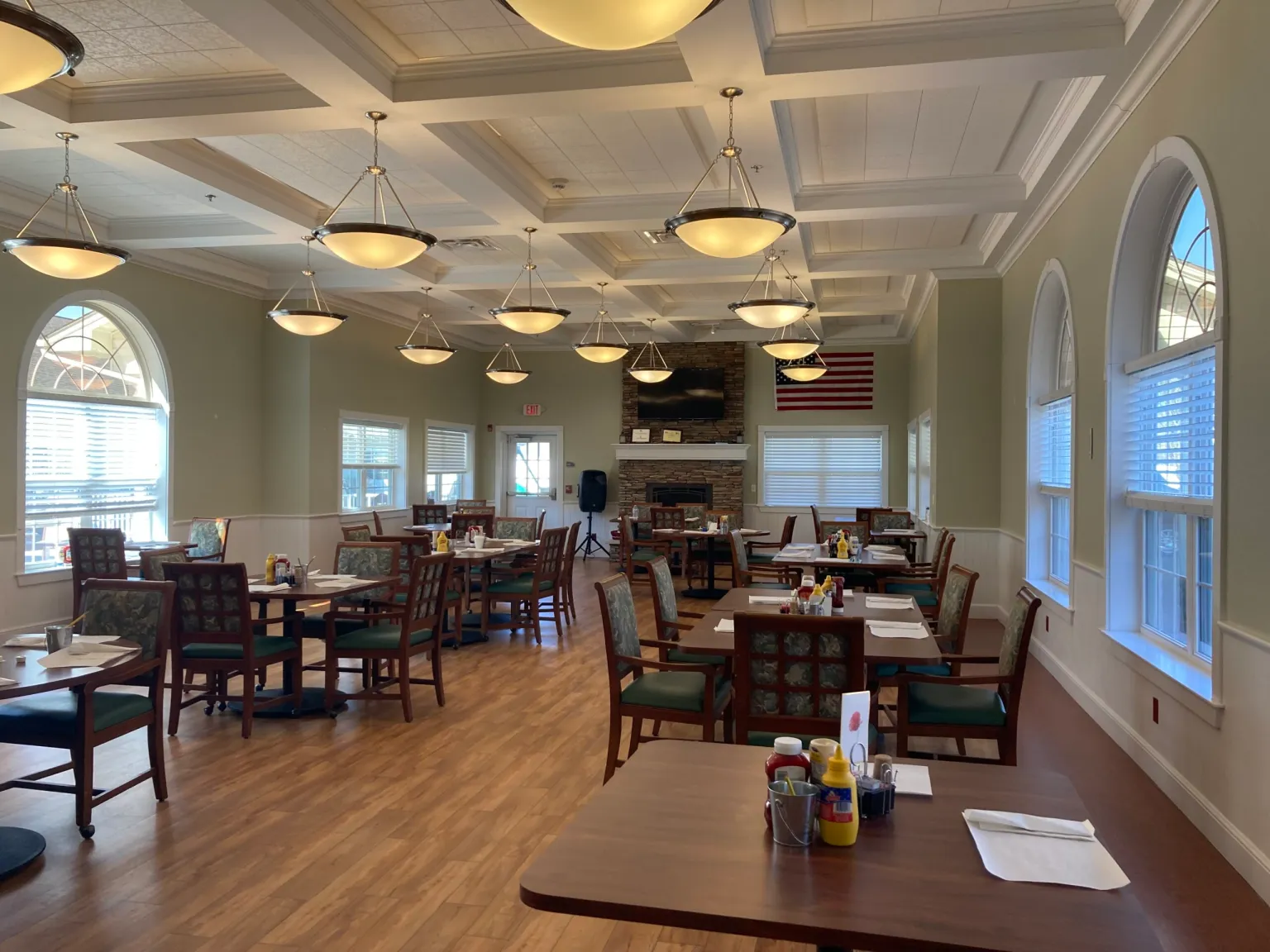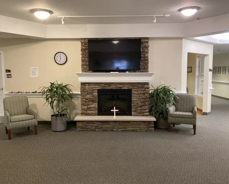 Original construction provided for a fifty-two bed facility with various common areas such as a dining room, a fireplace area, a sunroom, a theater, a café and activity room