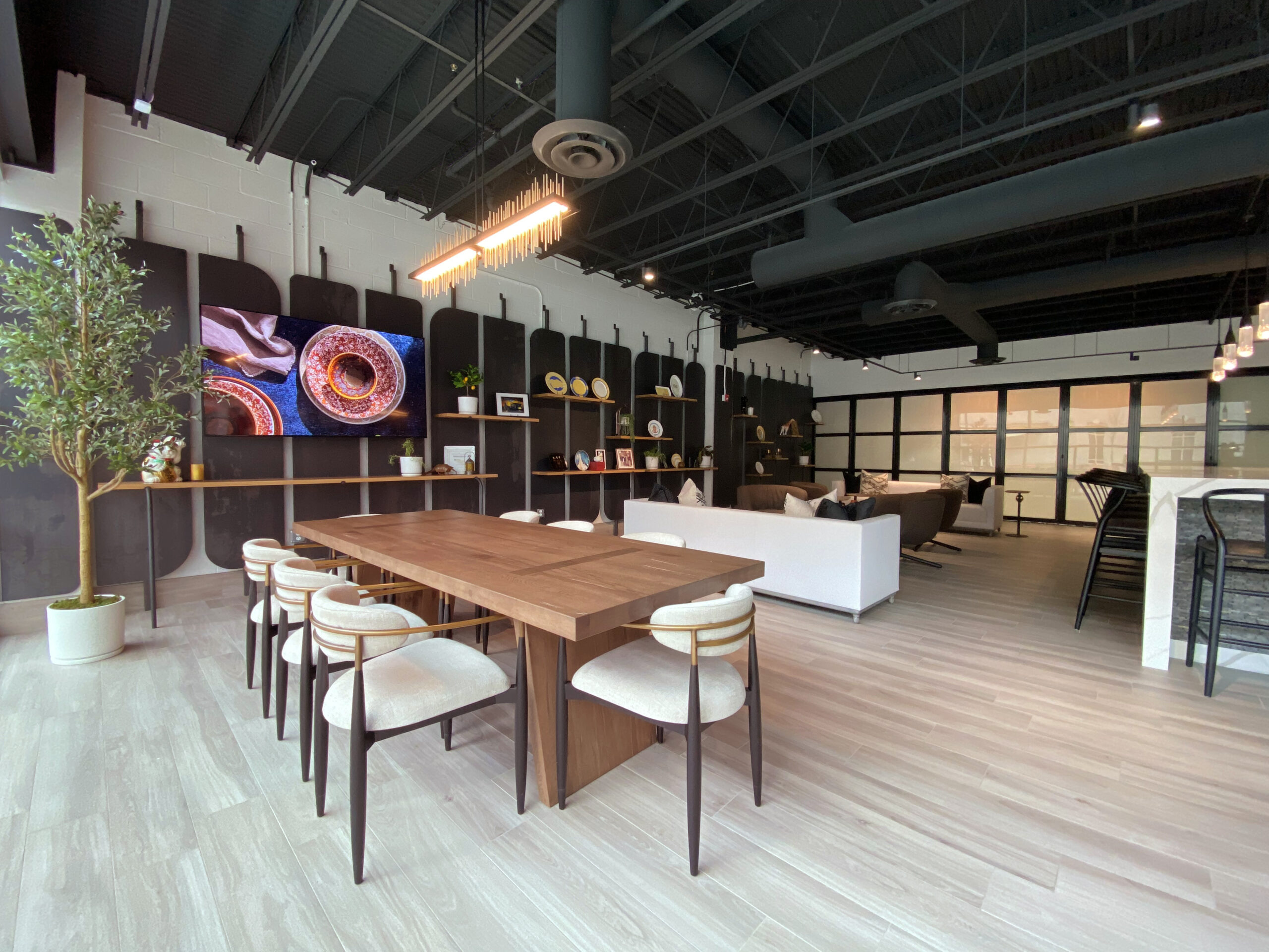 In Chicago, Illinois, a 4,400-square-foot showroom was created through interior alterations, featuring an open-concept layout with movable dividers and display cases. Carefully selected finishes and fixtures complemented open shelving and large windows, enhancing the tableware display.