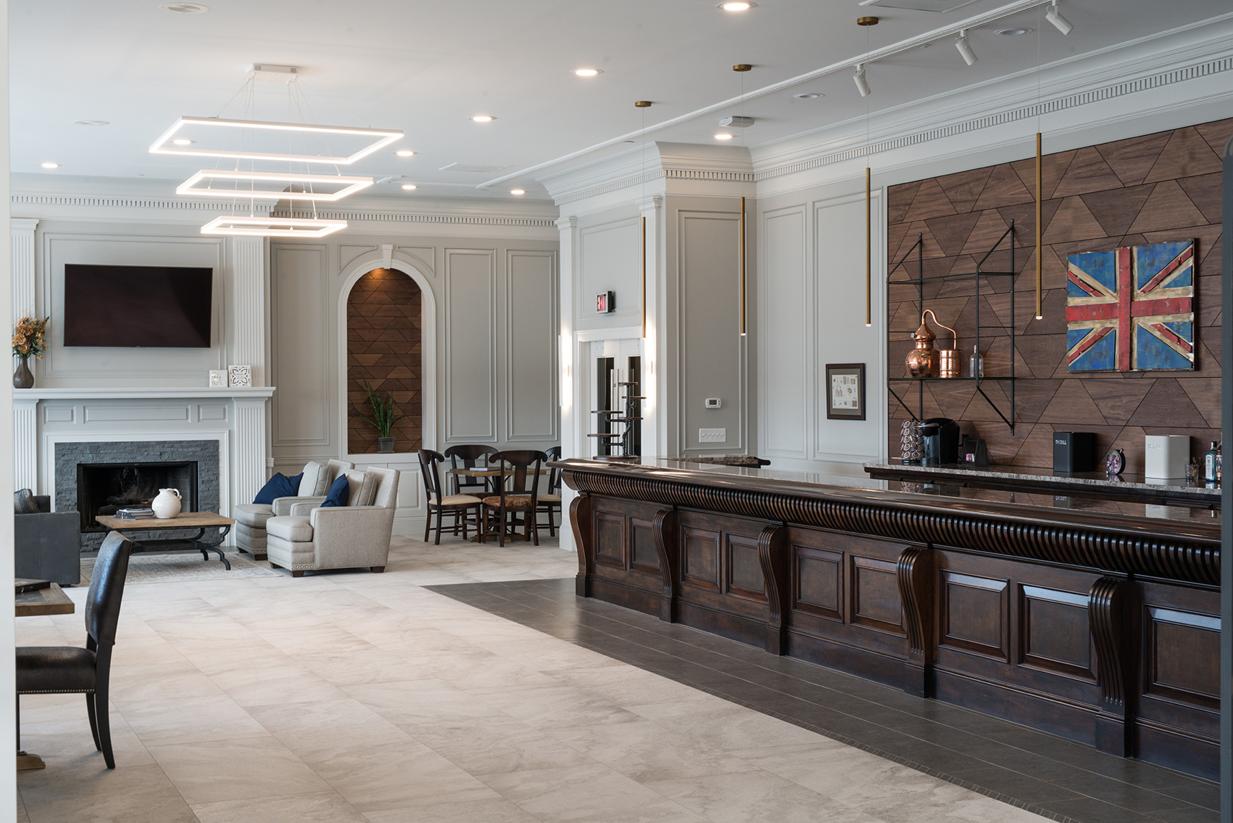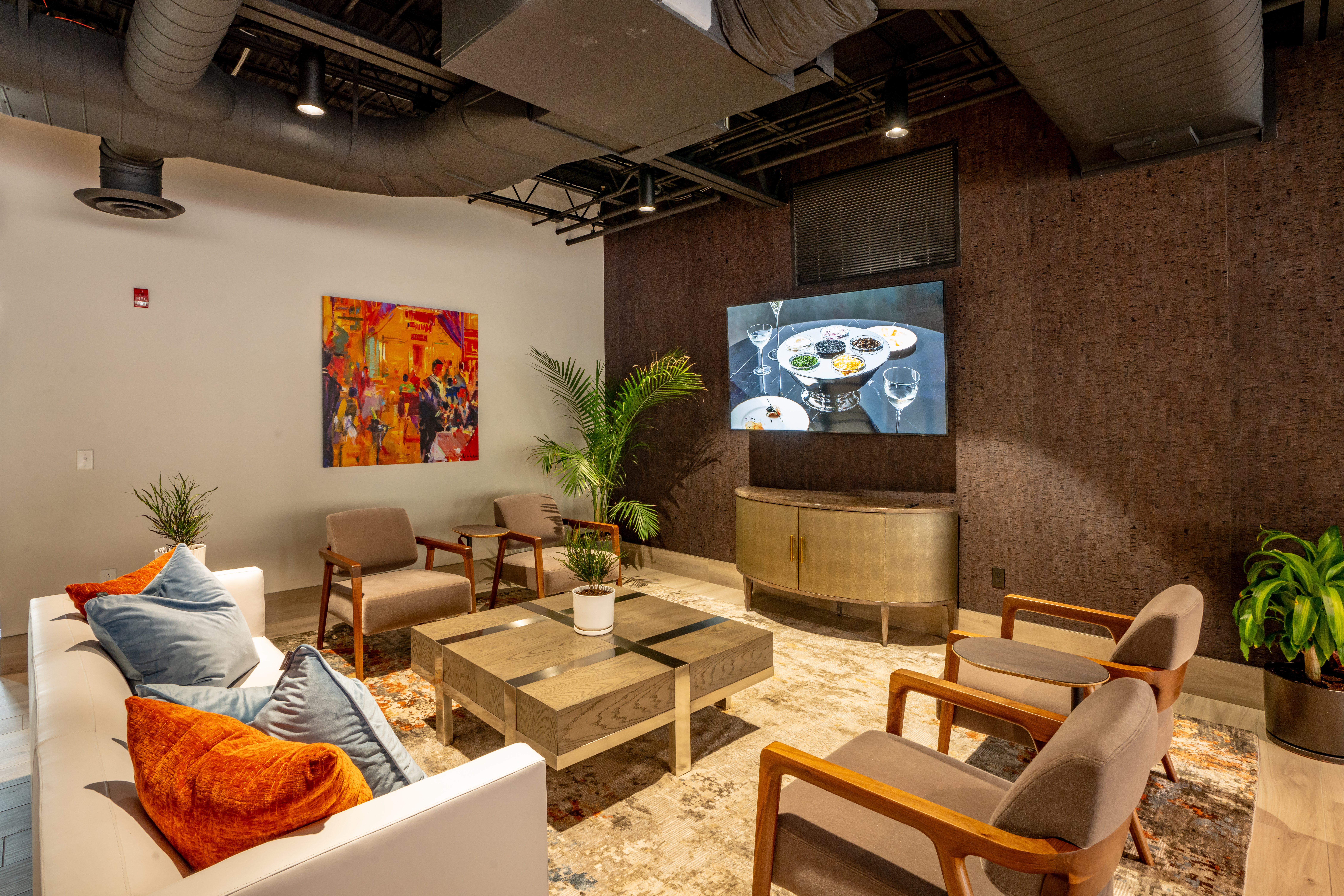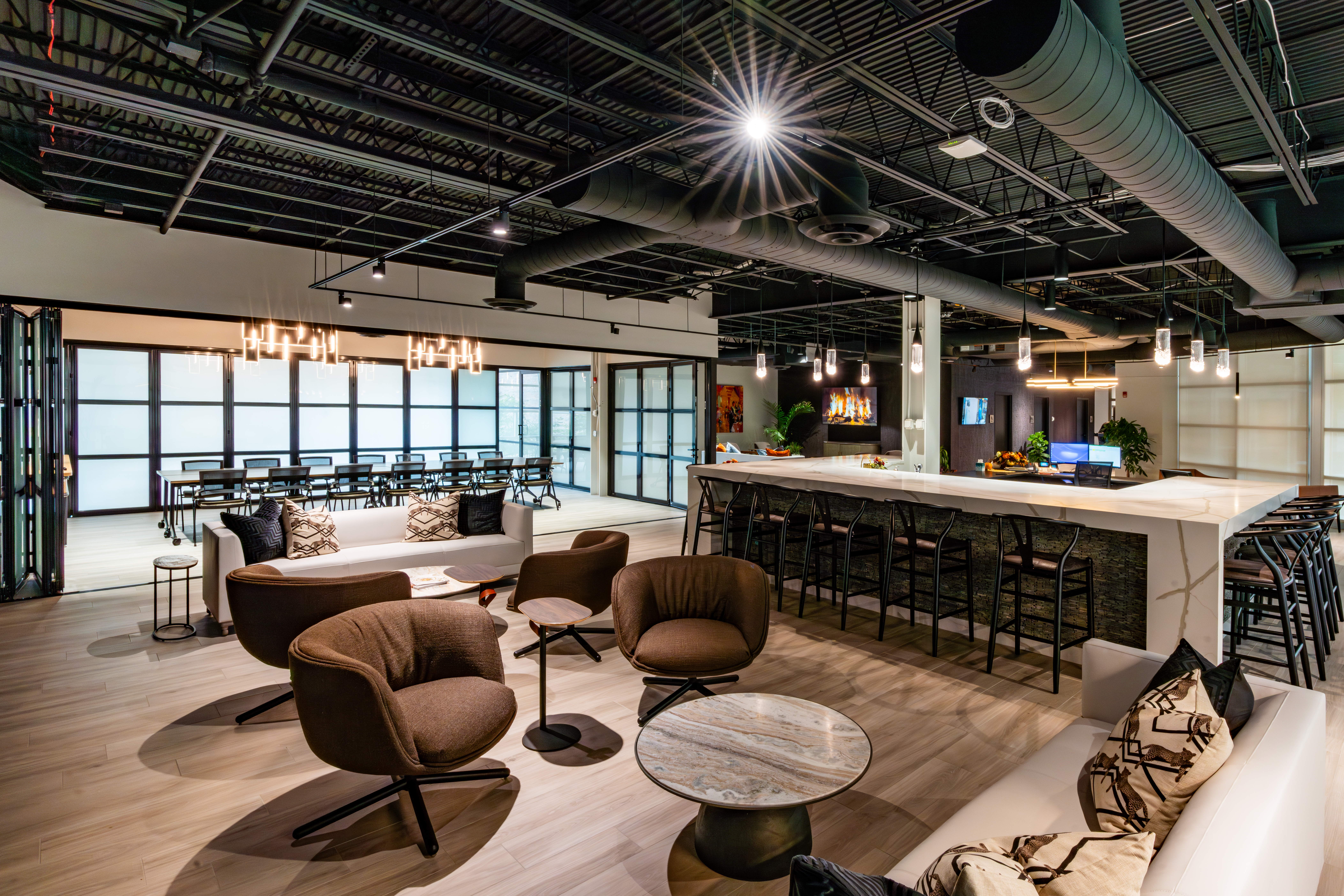 In Youngstown, Ohio, the firm renovated 23,800 square feet across three floors of the Taft Technology and Semple Buildings for new corporate offices. The modern design includes a welcome center, shuffleboard, seating, meeting spaces, employee kitchens, quiet rooms, and a quality control lab. The 14,000-square-foot quality control lab in the Semple Building involved repairing concrete floors and reconfiguring space for storage, testing, and offices, with renovated and new restrooms. An 8,000-square-foot showroom in the Commerce Building, previously an exclusive restaurant, was updated to display Steelite International’s dinnerware, flatware, and hospitality solutions, incorporating a bar and kitchen for an intimate entertainment venue overlooking downtown.